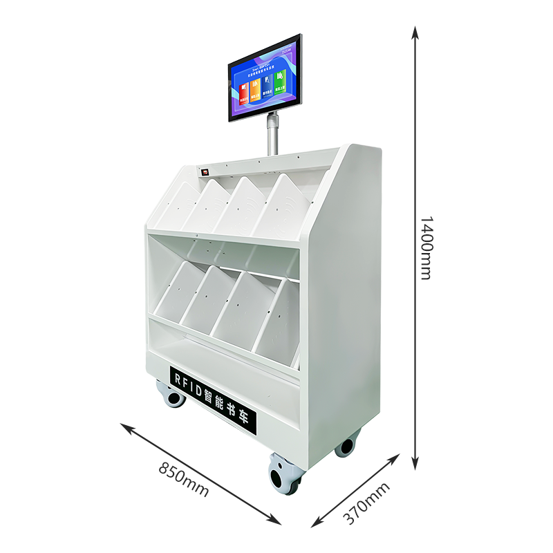 智能还书车是一种新型的智能化设备,配备触摸显示屏或简单操作的人机交流界面、图形界面,通过协议或其他网络及专用接口与图书馆自动化系统数据相连接,由读者自行对图书进行快速归还,读者把图书放到书车上,系统自动对图书进行归还操作,无须读者再做其他操作,极大限度简化读者归还图书的操作。